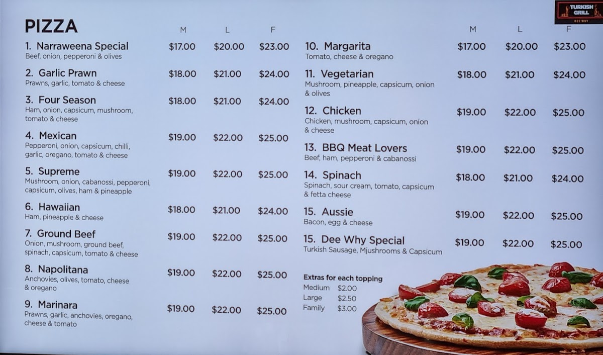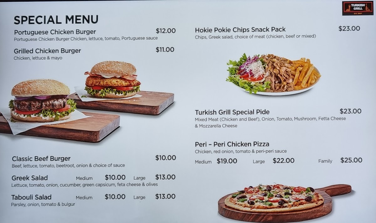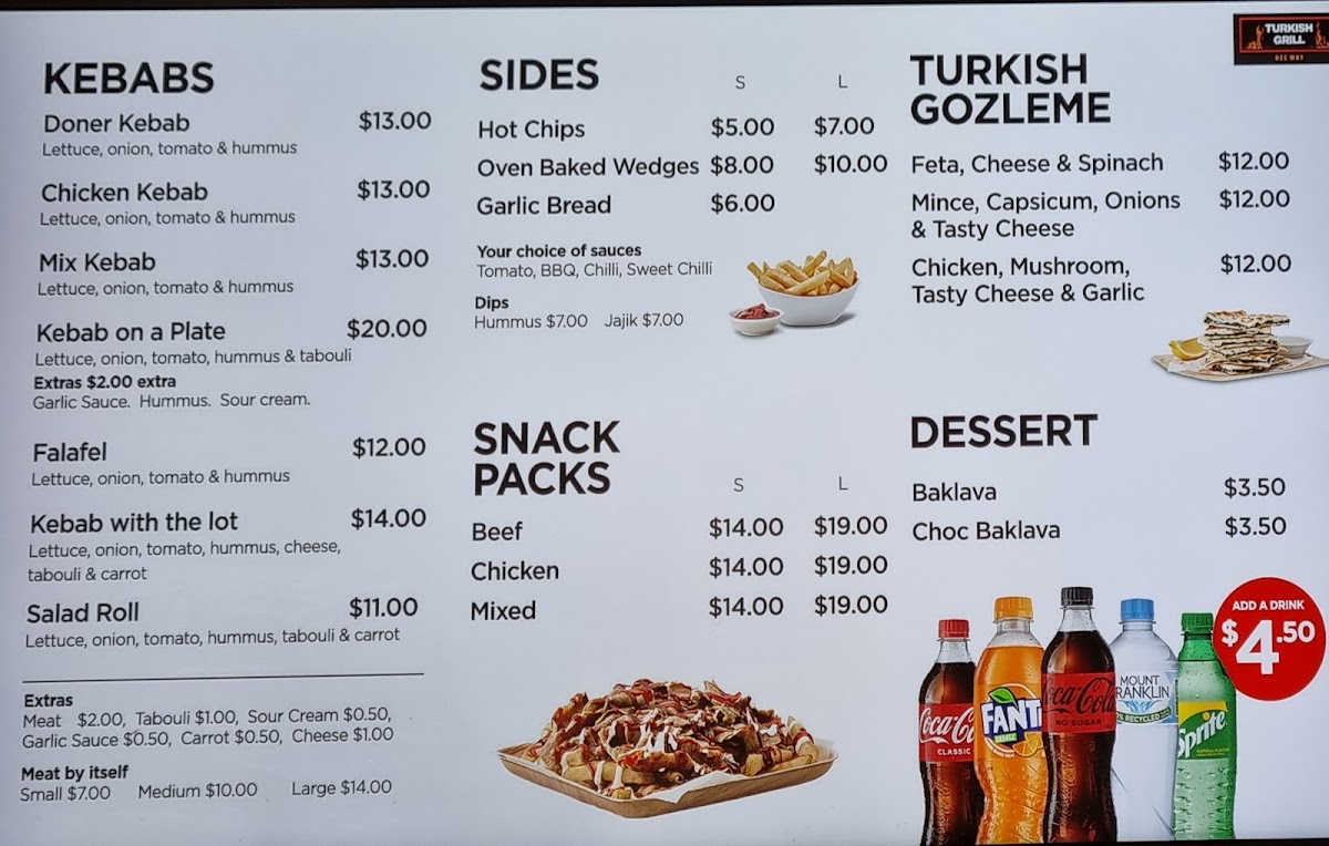 Dee Why Turkish Grill offers a wide array of flavorful dishes that cater to a variety of tastes. Their Pide Menu is a standout, with options like the Margarita Pide for $24, Narraweena Special Pide at $17, and the ever-popular Four Seasons Pide. For those seeking something light or quick, the HSP / Snack Packs are a great option, with choices such as Chicken Small, Hokie Pokie Snack Pack, and Beef Large. In addition, the Turkish Gozleme offers a savory, satisfying bite. When it comes to desserts, patrons can indulge in a Small Ben & Jerry's Ice-Cream or Large Ben & Jerry's Ice-Cream, or enjoy traditional Turkish sweets like Kunefe Baklava and Baklava. The Kebabs section also impresses, offering a variety of kebabs such as the classic Doner Kebab, Kebab With The Lot, and the Falafel Kebab. To complement these dishes, there are a selection of refreshing drinks like Mount Franklin Sparkling Water, Powerade, and Iced Tea. The Pizza Menu includes options like Garlic Prawns Pizza Medium and Hawaiian Pizza Large, while sides such as Oven Baked Wedges, Hummus, and Garlic Bread round out the meal. Whether you’re in the mood for a hearty meal or a light snack, Dee Why Turkish Grill offers something for everyone.